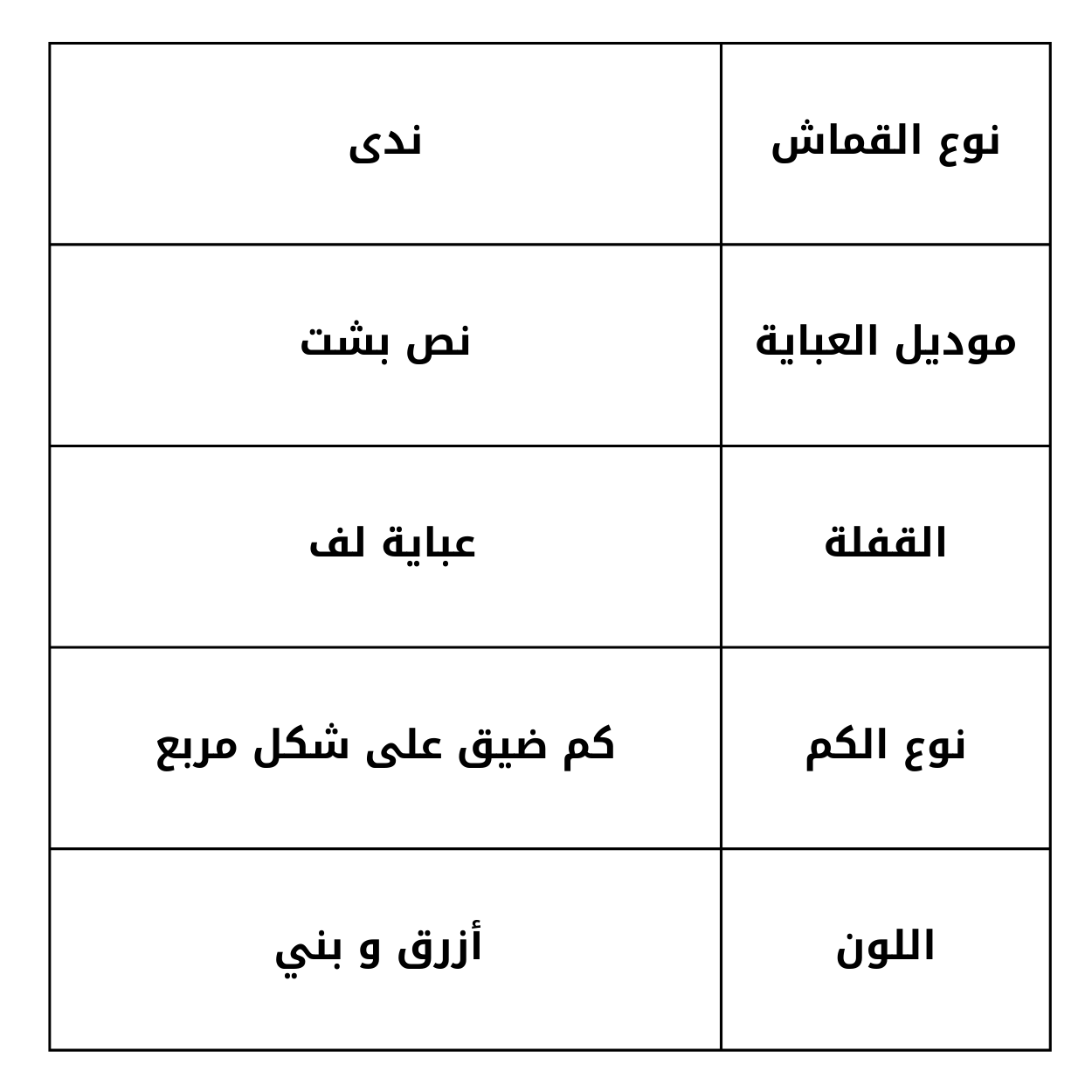 - نوع قماش العباية : قماش عباية بلاك بيري ( ندى ) ، خفيف و ناعم ، مصنوع من البوليستر ، لا يلمع ، إنه أفضل قماش عباية ما يحتاج كوي .