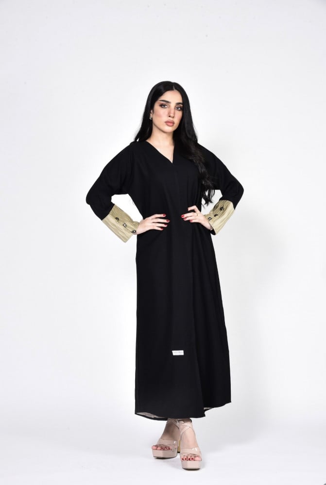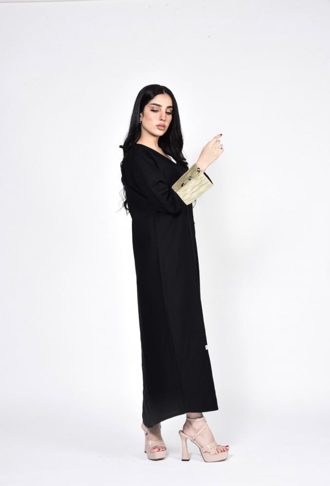 - الموديل : عباية كلاسيكية ناعمة ، اكمامها مزينة بالمخمل البيج الفخم مع أزرار فاخرة .