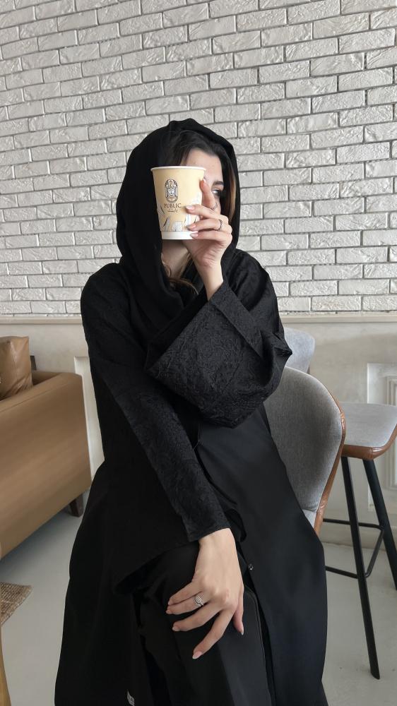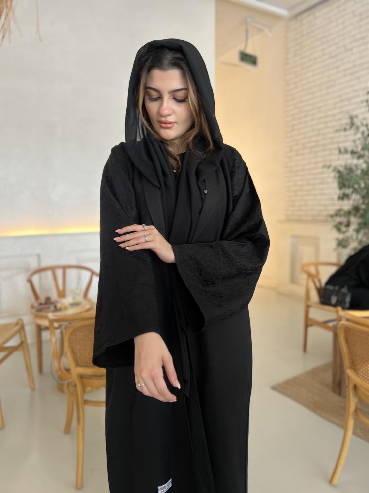 - الموديل : عباية سوداء فخمة بموديل كلاسيكي مريح ، مطرزة بالسدو الأسود على الاكمام ، مع ياقة بناتية أنيقة للغاية .