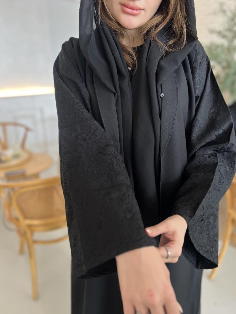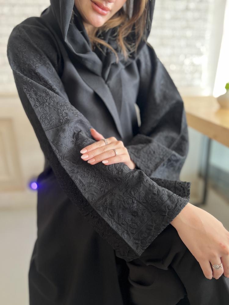 عباية بياقة كلاسيكية سوداء و أكمام مطرزة بالسدو