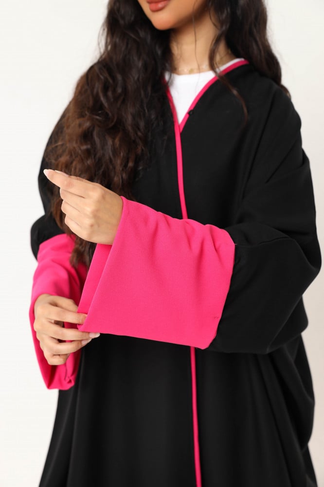 - الألوان المتاحة : عباية سوداء سادة بأكمام فوشي مع تطريز قيطان فوشي .